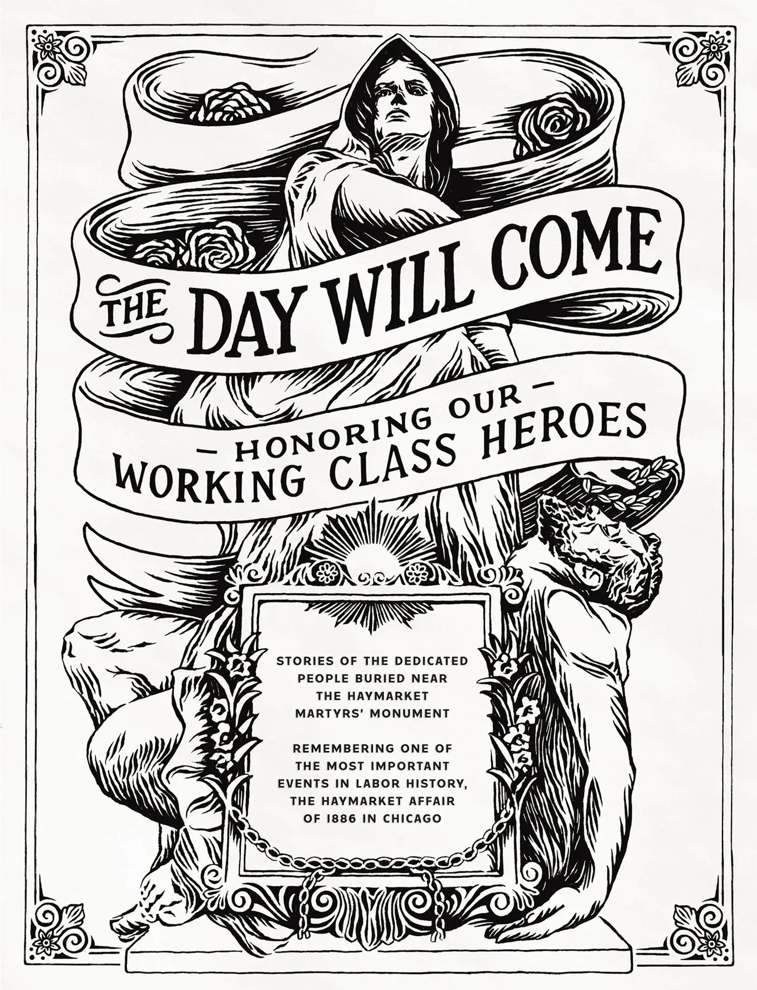 Representatives of the Historical Society of Forest park reached out about having me illustrate an updated cover for their booklet commemorating “stories of the dedicated people buried near the Haymarket Martyrs’ Monument, which serves to remember one of the most important events in labor history, the Haymarket Affair of 1886 in Chicago.